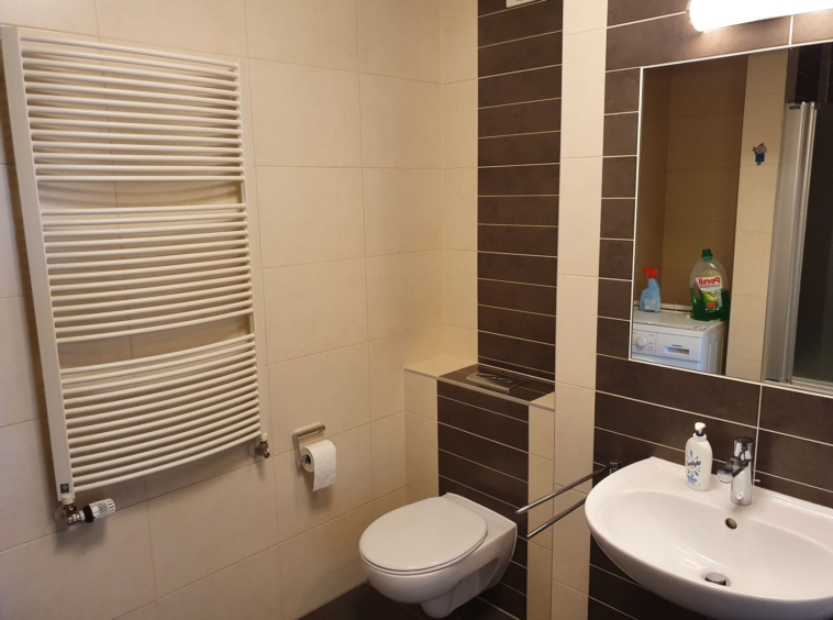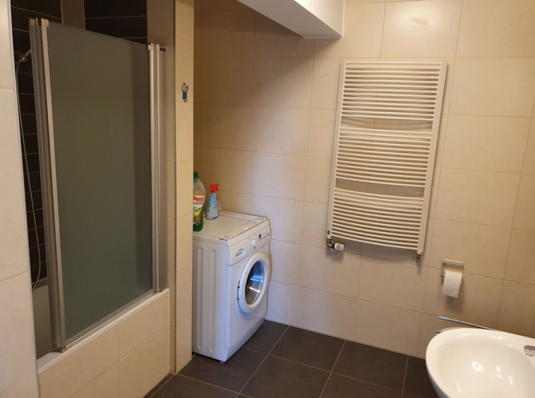 1 salle de bains avec baignoire, douche, lavabo,WC et emplacement pour lave-linge